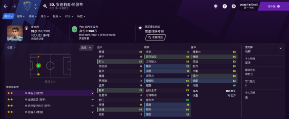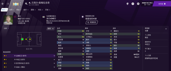 19岁的小将,各项属性都在及格线以上,具有很高的潜力。隐翥不错很容易就能练起来,也可以踢防守型后腰位置。