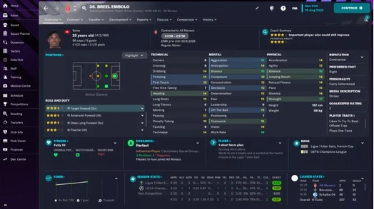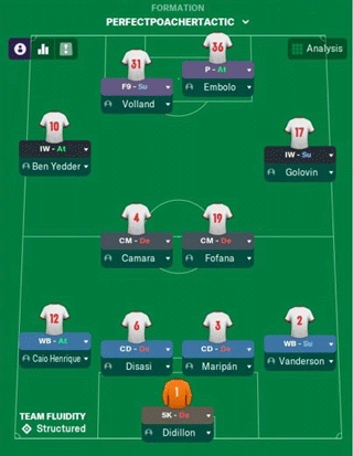 换几个球员就能形成全新进攻阵型,这证明了摩纳哥队的灵活性。Embolo除了是负责辅助工作的优秀目标前锋外,还拥有抢点型前锋的所有必要属性。他具备出色的射门、预测、无球跑、头球和弹跳属性,还拥有“打破越位陷阱”的关键特质。
