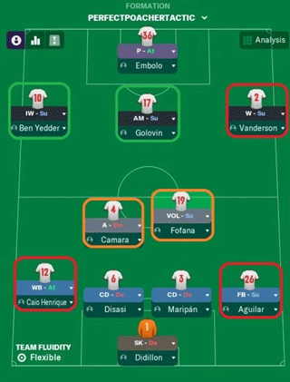 在这里,已选的两个更靠后的中场角色是防守型后腰和组织型后腰。防守型后腰位于非常靠后的位置,只关注重新获得和回收控球,组织型后腰承担更为自由的角色,允许其将传球推给前腰Golovin或边路球员。