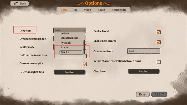 2、看到【Language】哪一行的语言切换往下翻找到简体中文,点击Reset确定。