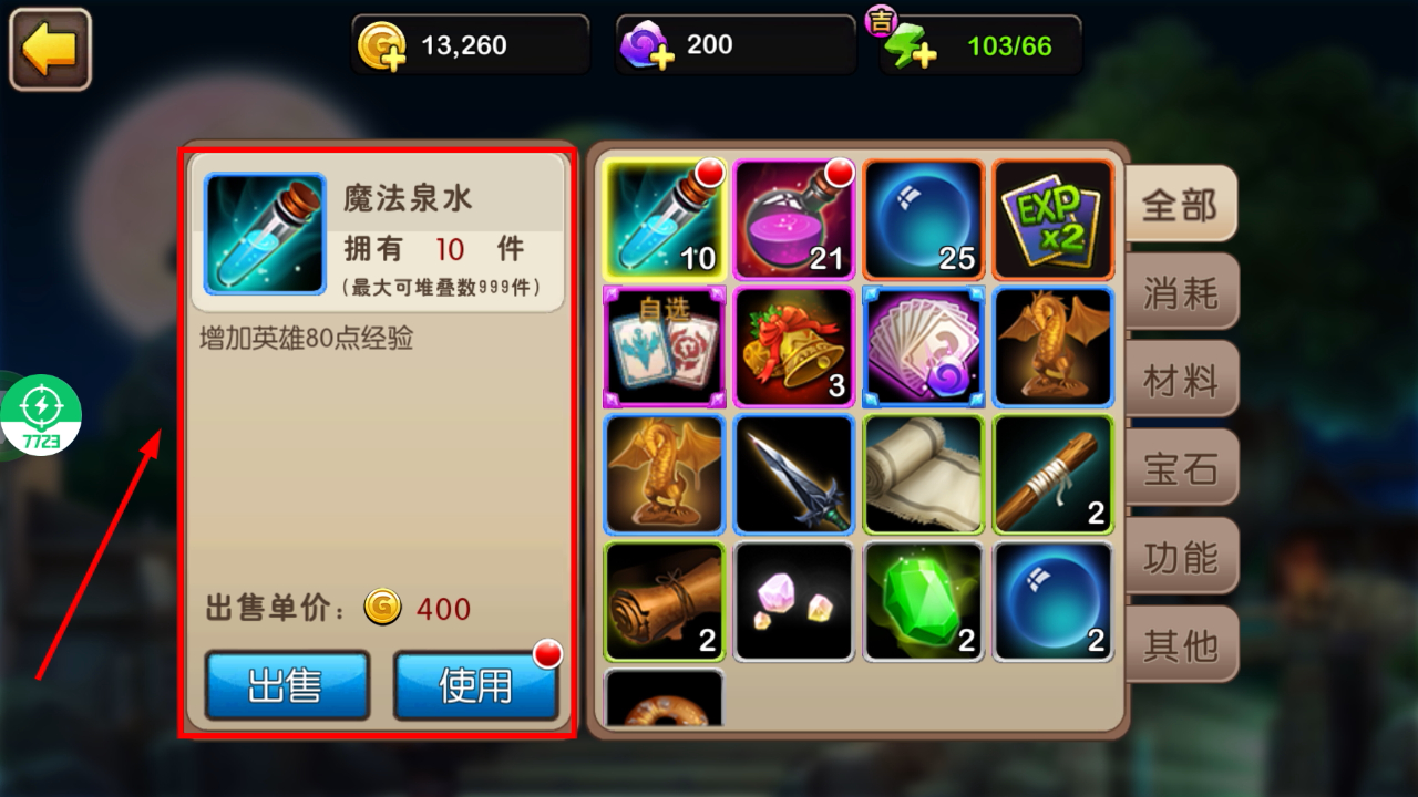 2、进入背包后找到【魔法泉水】,该道具可增加英雄经验,点击后选择使用选项,进入数量选择界面。