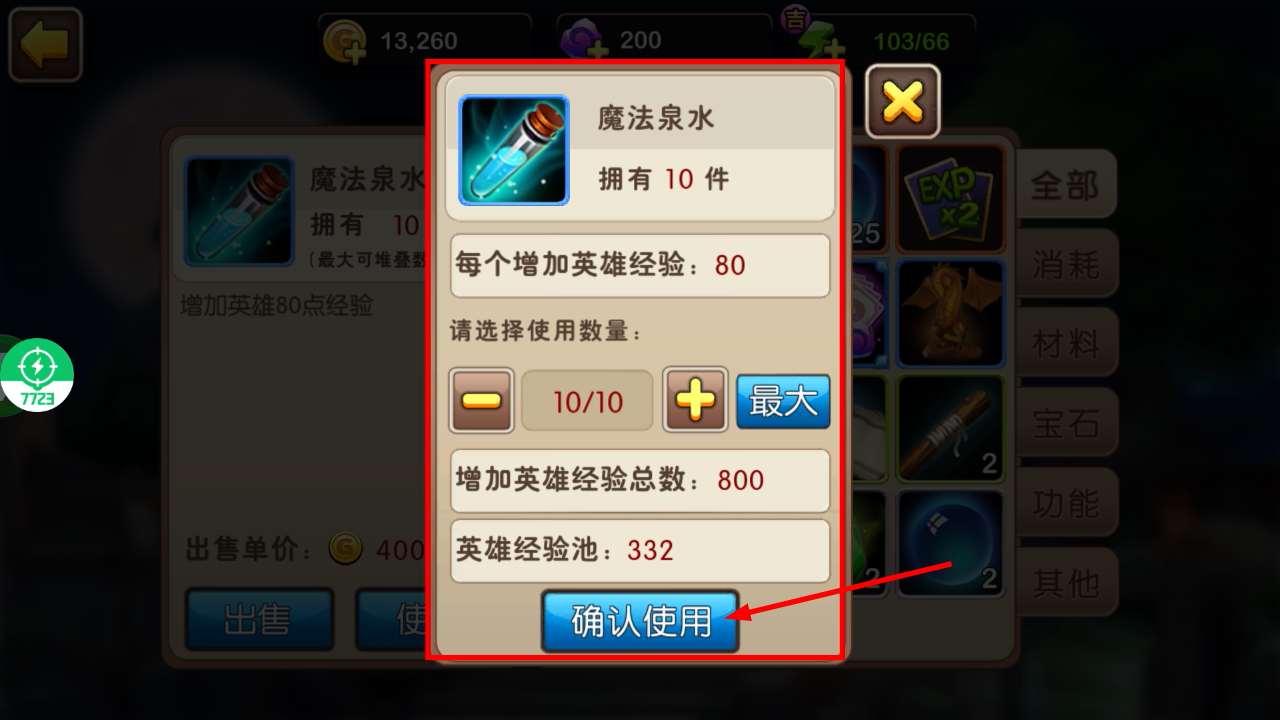 3、在魔法泉水使用界面选择合适数量,点击【确认使用】按钮,即可为英雄增加对应经验值。