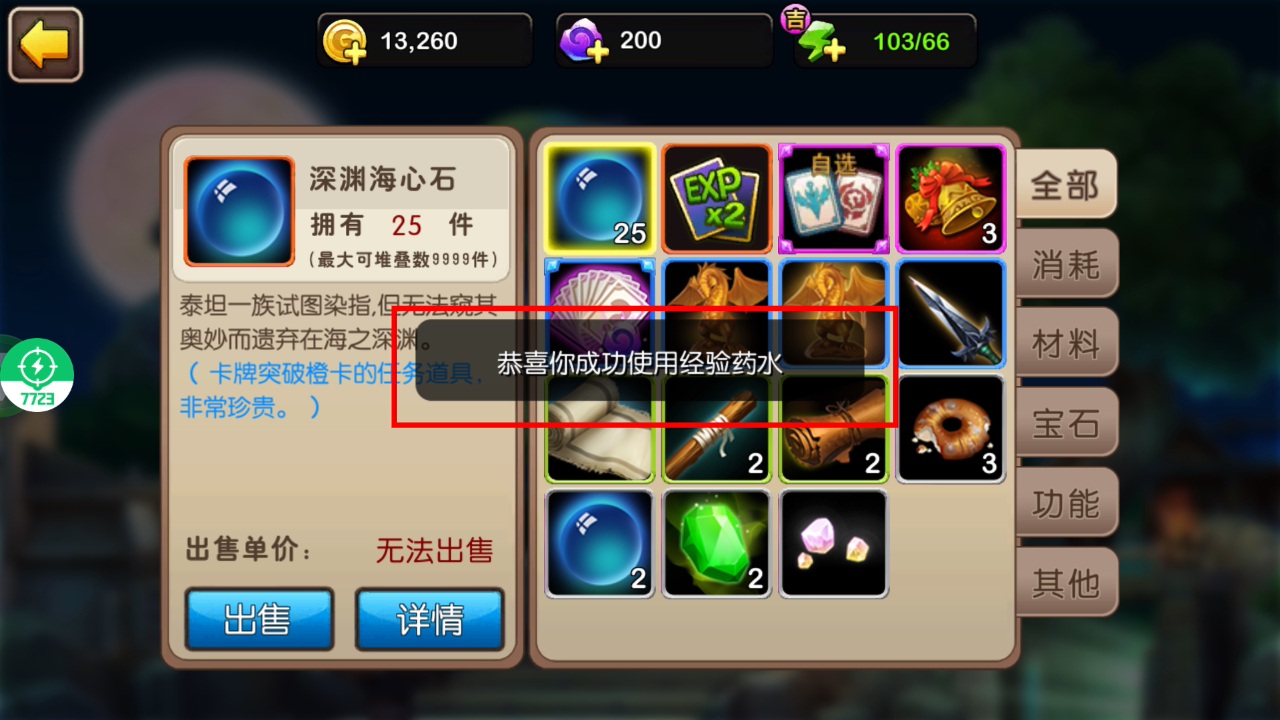 4、使用经验道具后会收到成功提示,背包中【深渊海心石】是珍贵突破材料,需妥善保存用于后续卡牌突破。