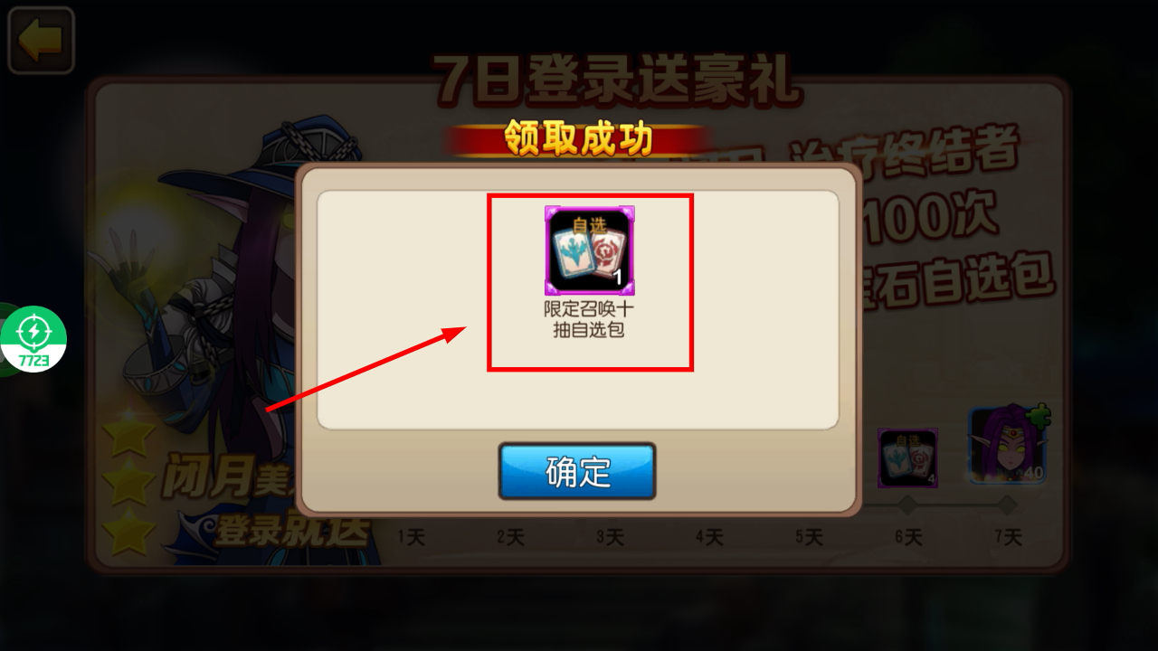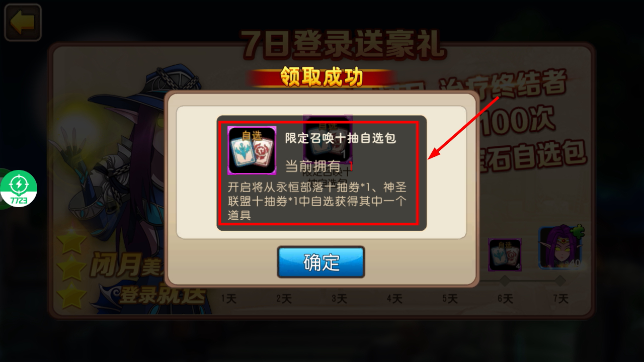 2、领取奖励后会获得【限定召唤十抽自选包】,点击确定按钮即可关闭提示弹窗并保留该道具。