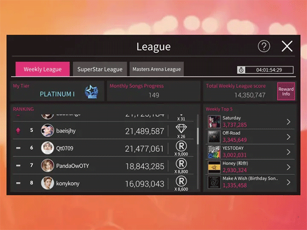 4、游戏系统将根据每首歌的前五名得分每周进行排名,并且高度会根据排名而变化。