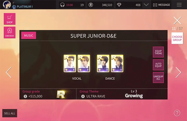 特别注意事项:除同一主题的更高等级的卡可以获得更高的分数加成之外,请闪家粉丝注意,部分主题卡组是没有Jonghyun的,如果要集第一套主题,请不要集没有Jonghyun的,不然分数加成会少很多。还有就是每逢大节日(春节等),或者大更新(比如这次版本更新)都会出现升级半价活动,有条件的请一定攒着钱等到活动再升级,你就会获得双倍的快乐