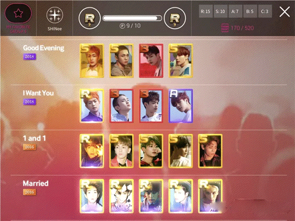 鉴于我们之前提到周常竞赛是五个组合,而且要尽量高分,所以即使你是某个团的铁粉也请不要只致力于集一家的卡。我当时在国服就是只爱集SJ的卡,然后活动竞赛打得一塌糊涂,导致资源获取不到,SJ有了新卡更拿不到了。然后按等级说,每张卡有CBASR五个等级,CBAS成功升级四次后,可以和另一张同等级满星卡升级。虽然这个升级概率比较随机,但是普遍成功率还是挺高的(只要你合理搭配),而且满星卡的合成升级是100%会成功的。