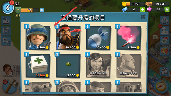 3、在升级界面,点击【升级】按钮,启动步兵升级。