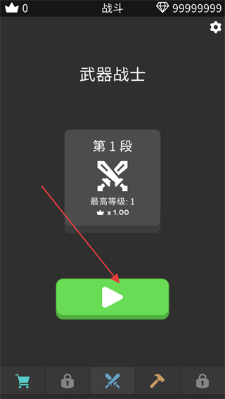 1、点击绿色播放按钮开始【武器战士-第1段】战斗,该阶段最高等级1,初始战斗可熟悉基础玩法。