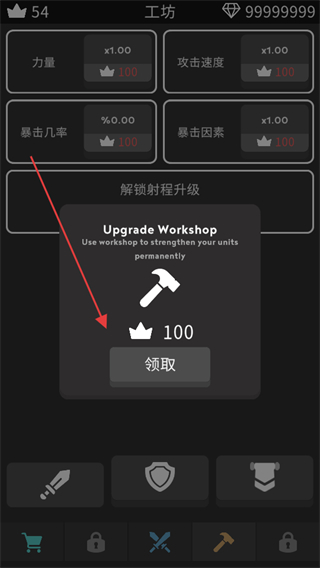 2、在工坊界面点击【领取】,获取【100】皇冠资源。