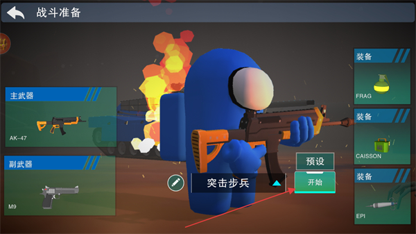 1、在战斗准备界面,选择主武器如AK-47、副武器如M9及装备,点击开始进入对战。