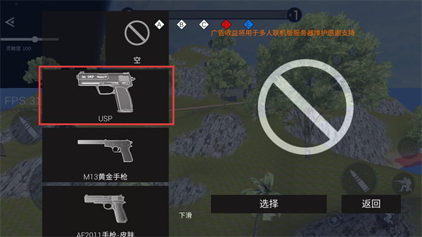 2、在武器选择界面选定【USP】等副武器,点击【选择】按钮完成配置,丰富战场作战手段。