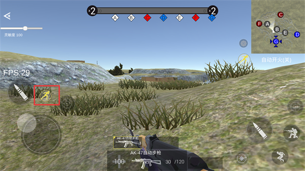 3、进入战场后,点击对应功能按钮,操控角色利用地形掩护推进,同时留意阵营进度条。