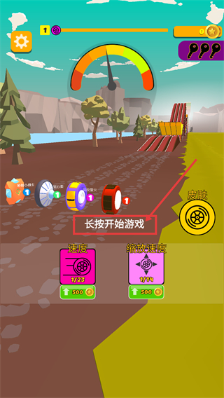 1、进入游戏界面后,长按【长按开始游戏】启动挑战,可查看【速度-1/23】【缩放速度-1/14】的属性,也能点击【皮肤】更换轮子外观。