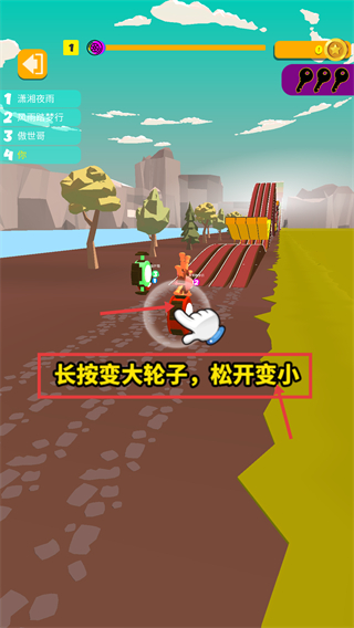 2、赛程中按【长按变大轮子,松开变小】的规则操控轮子尺寸,当前【排名-4】,需通过调整轮子来追赶前方对手以提升位次。