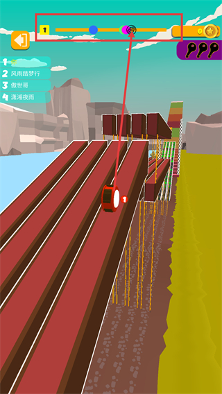 3、调整轮子大小后成功升至【排名-1】,沿赛道推进时留意上方进度条状态,保持操控节奏向终点前进。