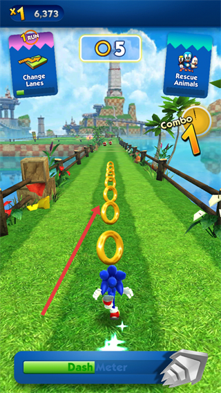 1、操控索尼克在跑道上前进,收集路径中的金色圆环,积累分数和资源。