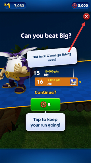 3、完成一局奔跑后,在结算界面点击叉号,关闭对话弹窗查看得分情况。