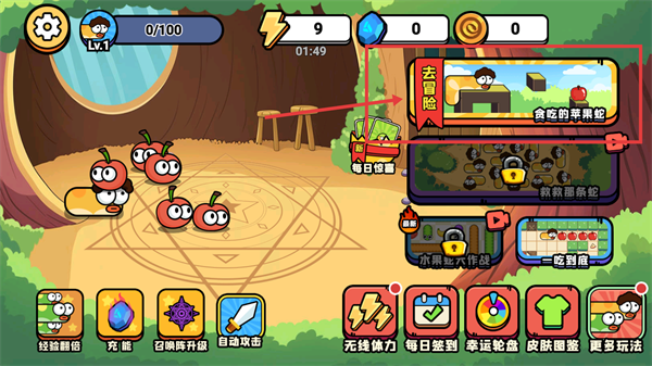 1、进入主界面后,点击【去冒险】进入【贪吃的苹果蛇】玩法,可借助【经验翻倍】【充能】功能。