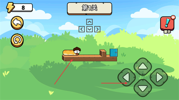 3、进入【第1关】后,通过方向键操控蛇形角色移动,目标是抵达场景中的蓝色门,遇到障碍时可借助【提示】功能获取指引。