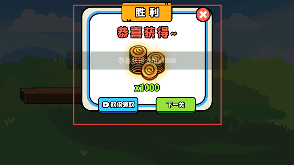 4、通关后弹出【胜利】界面,可领取【金币-x1000】奖励,选择【下一关】继续挑战,或选【双倍领取】看广告获得双倍奖励。