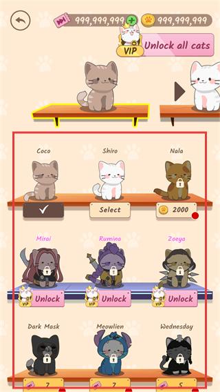 1、在猫咪选择界面,可选中【Coco】等猫咪,也能消耗资源解锁其他猫咪,配置互动角色。