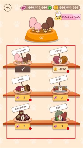 2、在食物选择界面,选定【Ice-Cream】,也可消耗资源解锁【Candy】等食物,配置互动道具。