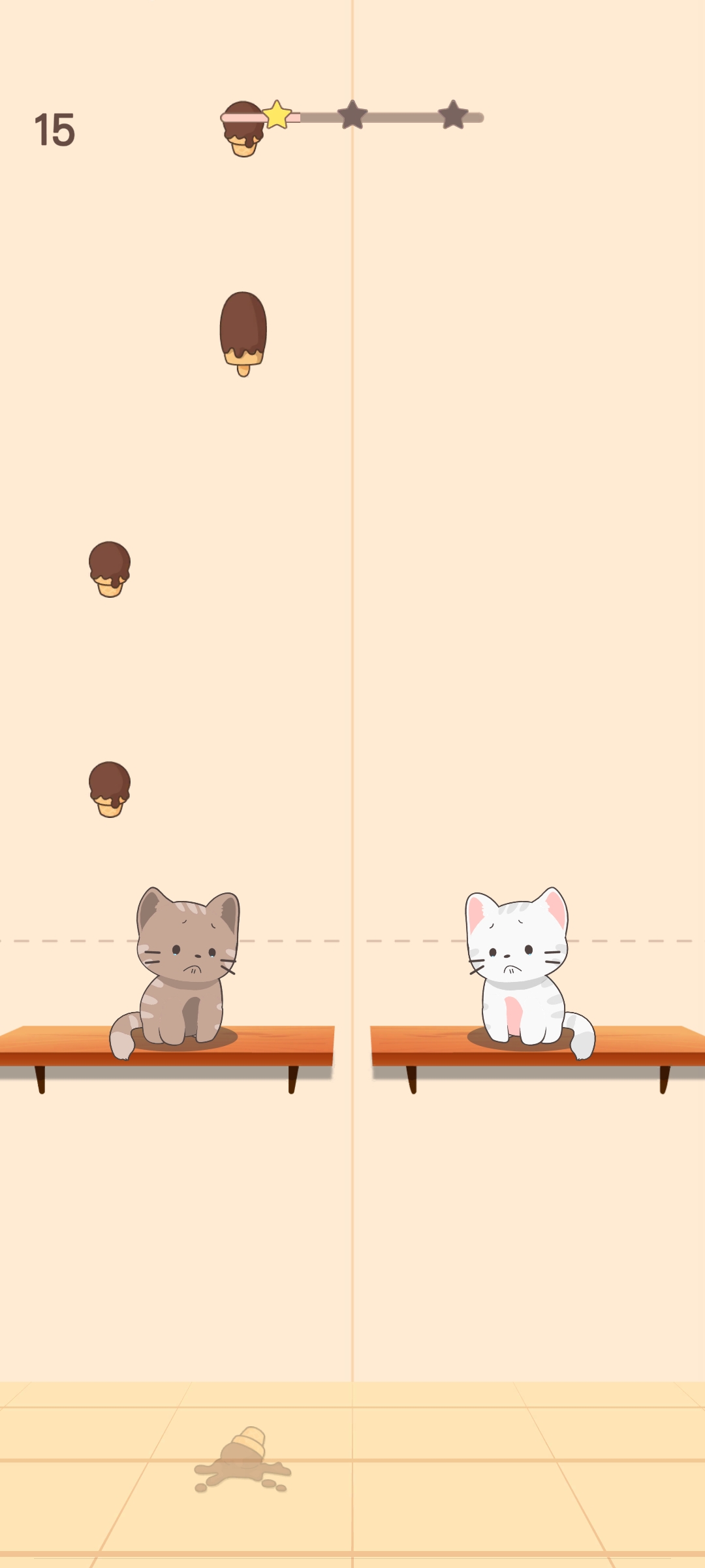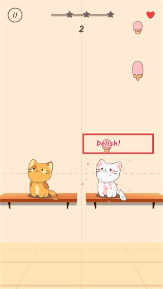 3、进入互动关卡,进度显示【2】,拖动区域让白猫接触冰淇淋,触发【Delish!】提示推进进程。