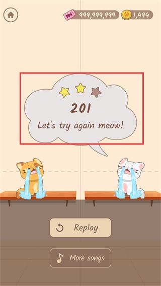 4、关卡结束显示得分【201】与提示【Let's-try-again-meow!】,点击【Replay】重新挑战关卡。