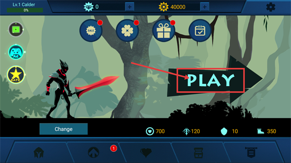 1、进入主界面后,确认【Lv-1-Calder】的状态,点击【PLAY】按钮进入关卡,同时留意当前【700】爱心等资源数值。