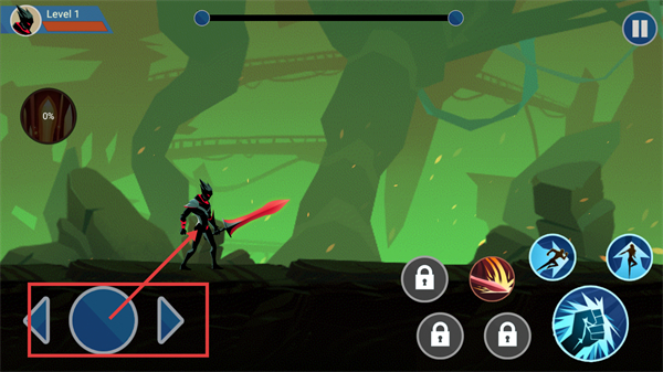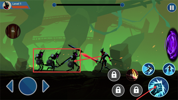 2、进入关卡后,通过左侧移动按钮控制角色移动,关注右侧已解锁的技能,准备应对后续出现的敌方单位。