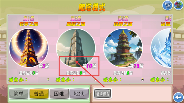 1、在爬塔模式界面选择章节,比如【第2章-启程之塔-共10层】,选定难度后点【继续游戏】开启挑战。