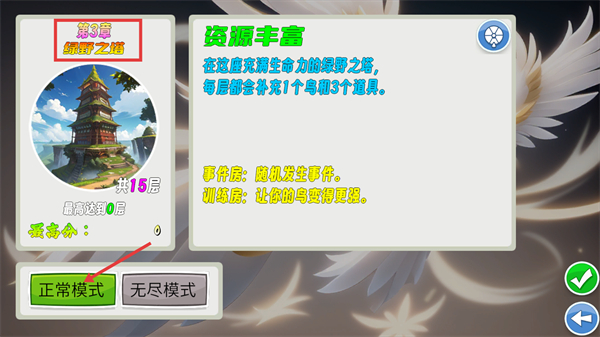 4、挑战【第3章-绿野之塔】时选【正常模式】,每层可补充鸟和道具,利用事件房、训练房强化阵容。