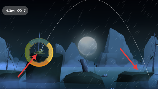 3、滑动操作后,青蛙会沿轨迹移动至目标区域,完成虫子捕捉,界面同步更新移动距离等数据,持续推进游戏进程。