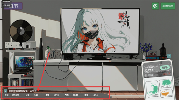 1、初始界面可通过【刷新初始属性(仅第一天生效)】调整【天赋】【认知】等属性,首日调整能优化初始状态。