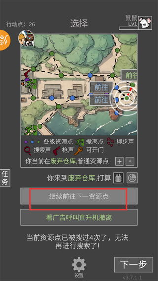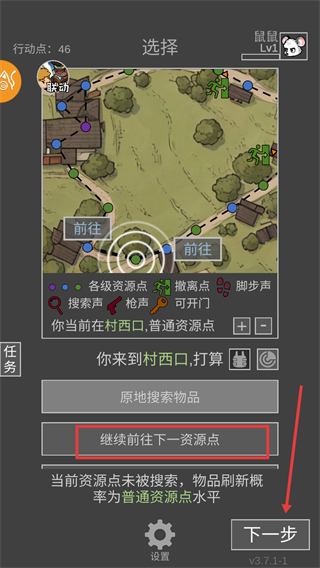 1、点击【红色框】选中“继续前往下一资源点”选项,【红色箭头】指向右下角“下一步”按钮确认操作。