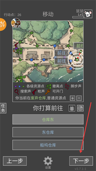 2、可选择前往仓库东、东仓库、船坞仓库,点击【红色箭头】指向右下角“下一步”按钮确认移动方向。