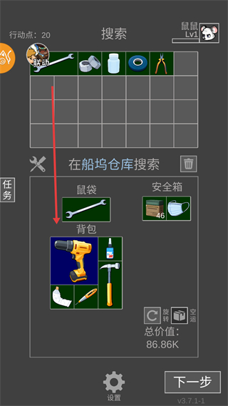 3、将搜索到的物质按【红色箭头】指向背包栏物品区域,底部设下一步按钮。