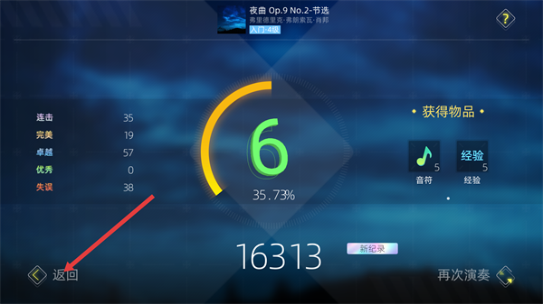 4、演奏结束后,可查看【连击】【完美】等数据及最终得分,点击【返回】可回到歌曲列表或选择再次演奏。