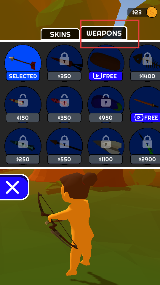 4、切换至【WEAPONS】界面,用金币解锁新武器,提升角色的战斗实力。
