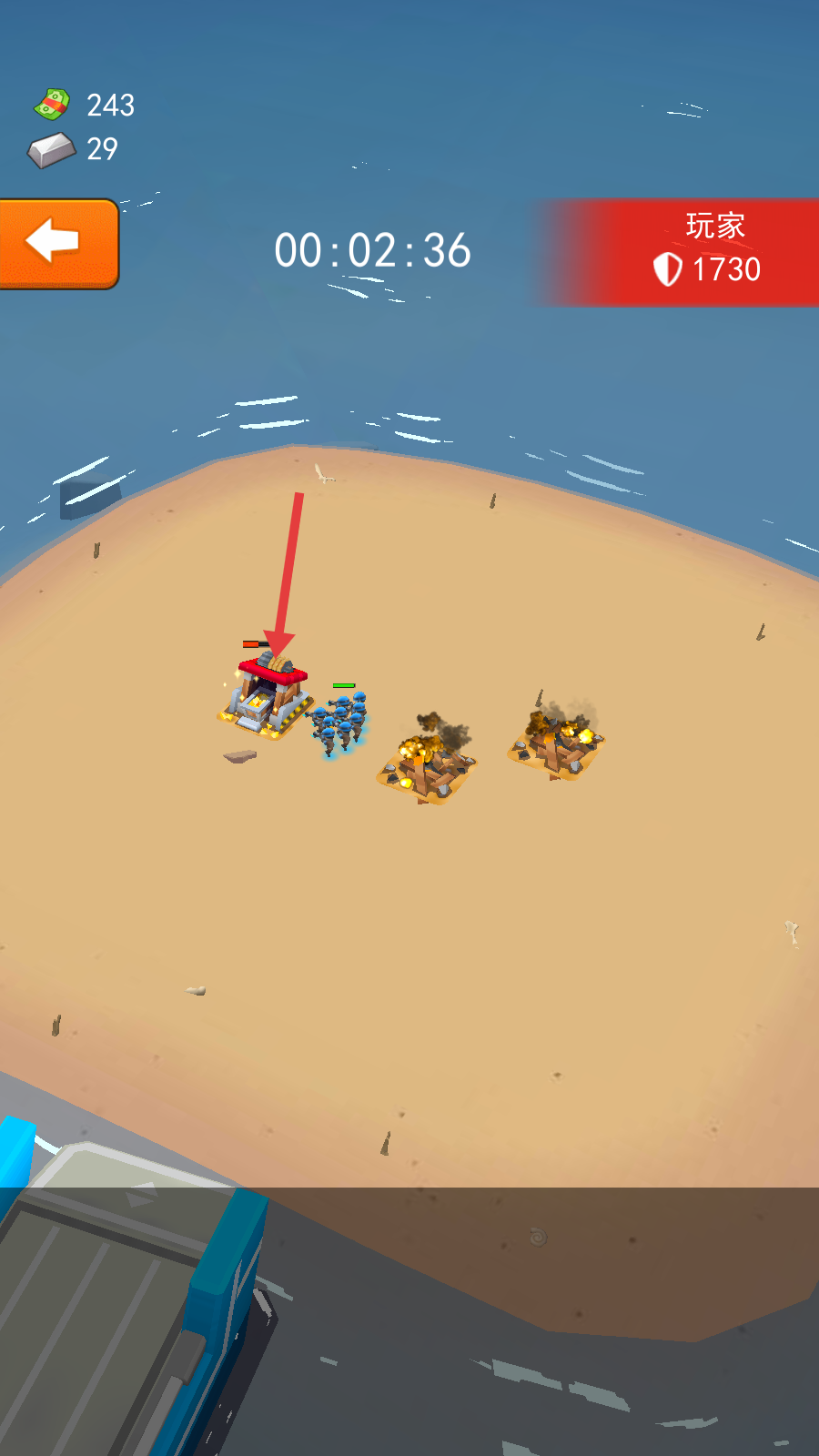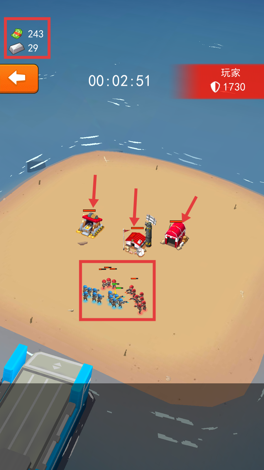 2、关注资源数量有利于我们进行战斗决策,确认局面有利后,派遣士兵进攻敌方建筑,推进战局。