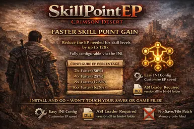 《红色沙漠》更快技能点MOD。在猩红沙漠中获得技能点非常耗时。这个模组降低了经验阈值,使每次技能点升级都更快——可以通过一个简单的INI文件进行配置。