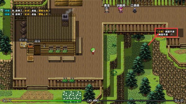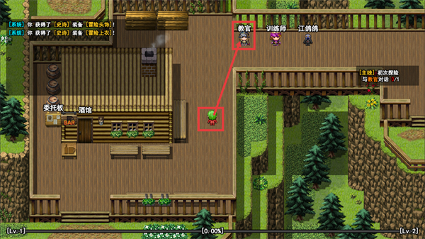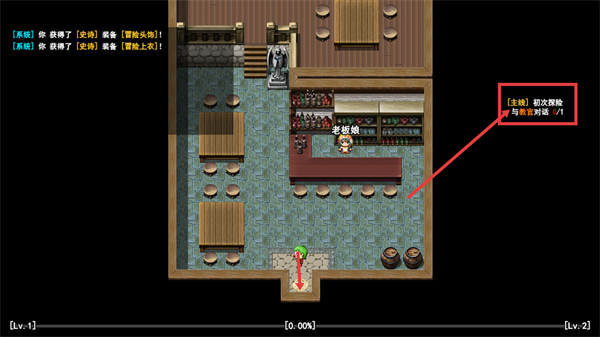 2、进入场景后装备【冒险头饰】和【冒险上衣】,接着接取【主线】-【初次探险-与教官对话-0/1】任务,找到老板娘所在区域推进流程。