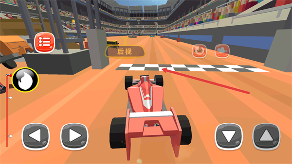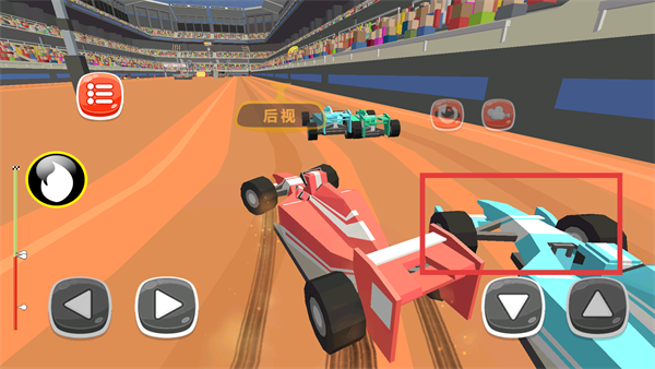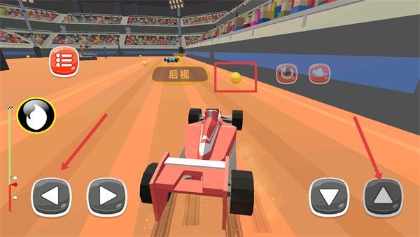 2、用左右按键操控赛车移动,行驶中拾取【金币】,同时借助【后视】功能观察后方情况。
