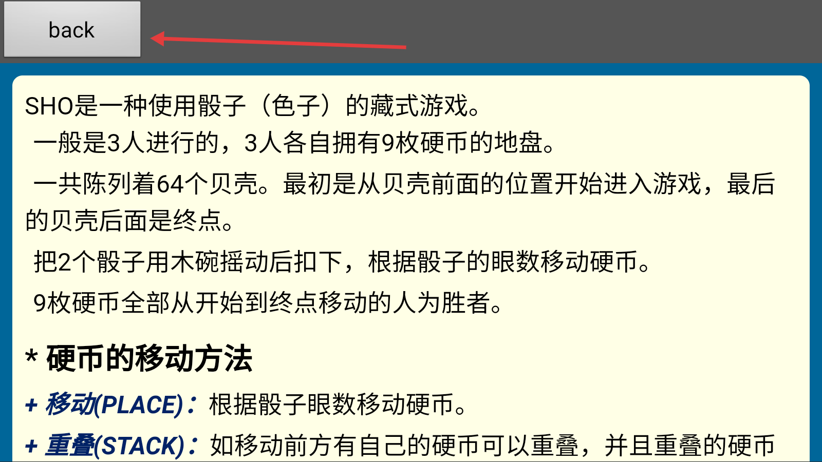 1、了解游戏规则,了解完后,点击back,开始游戏。
