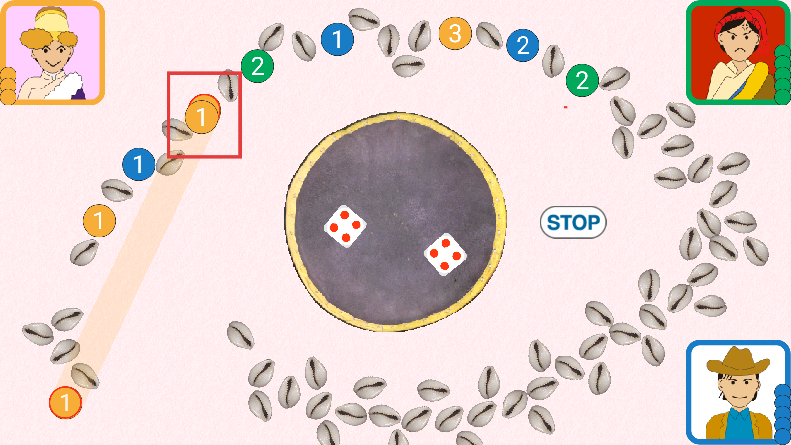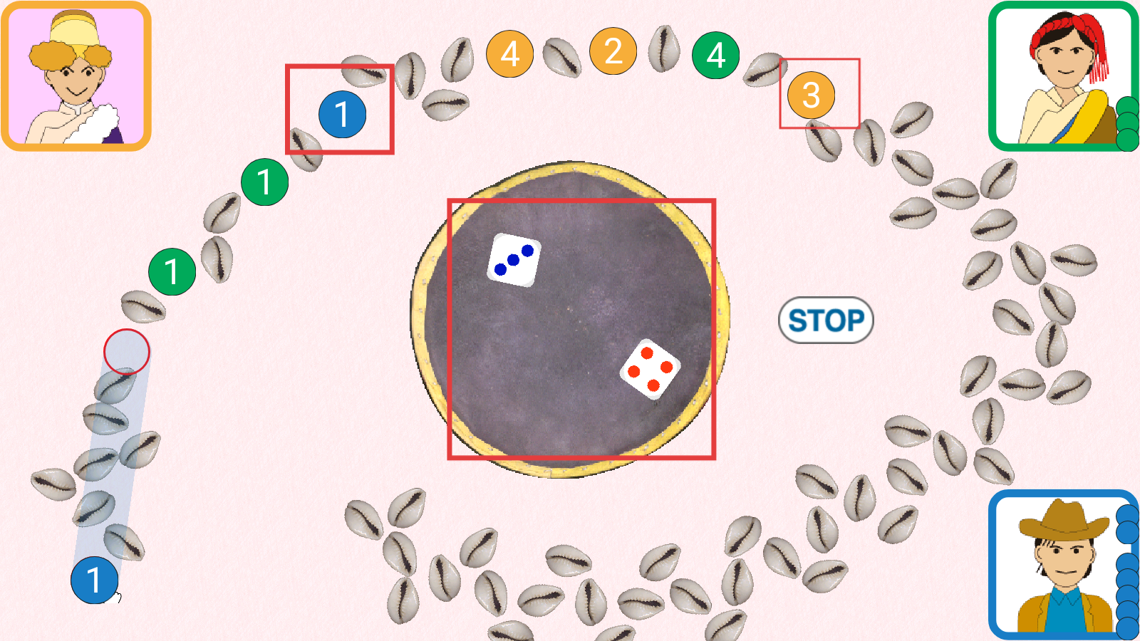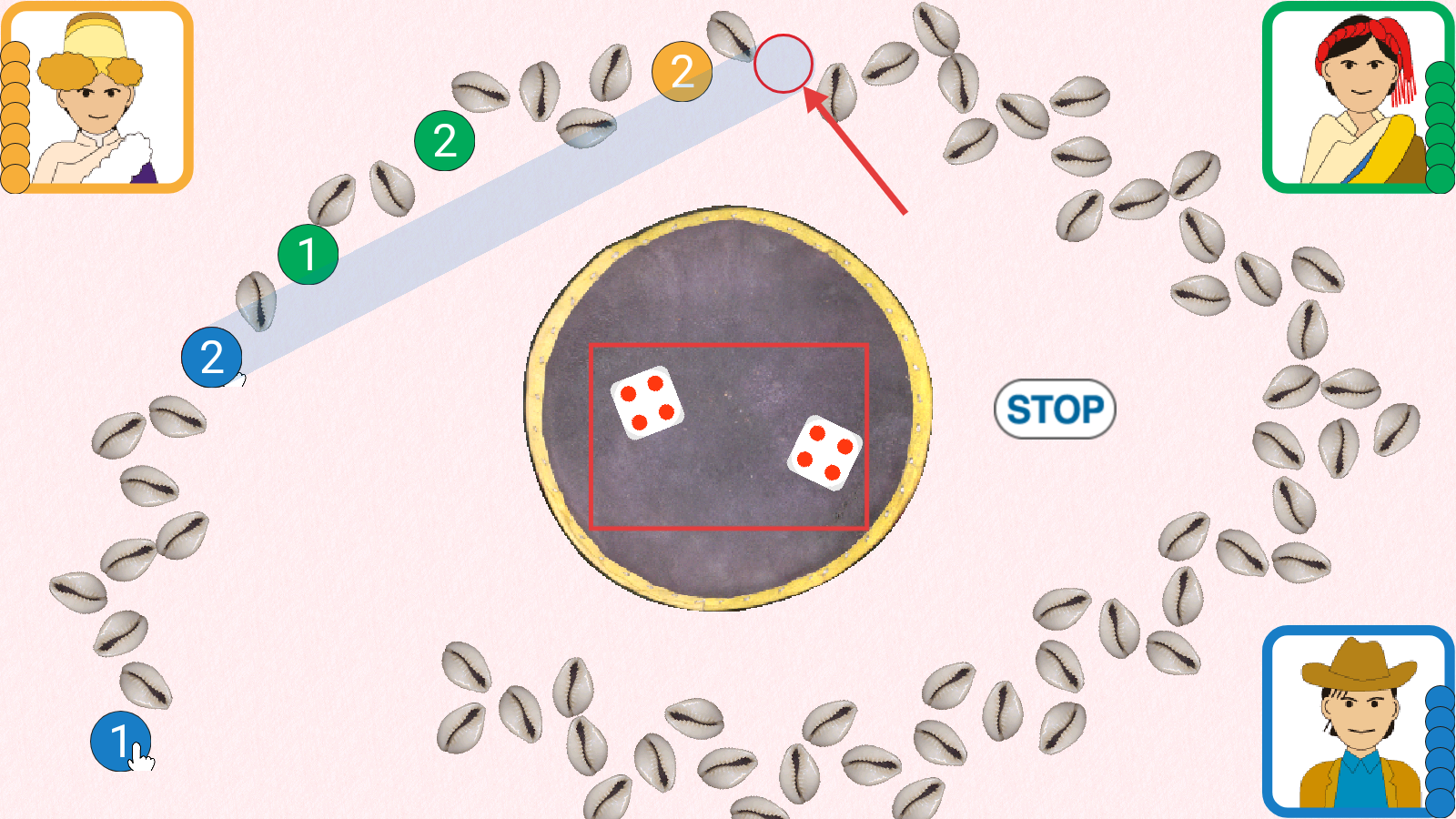 2、投掷出骰子点数后,根据点数点击对应区域的贝壳,移动自己的硬币推进进度。