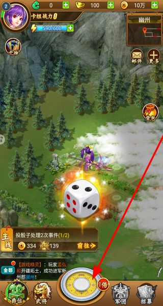 1、点击的骰子区域投骰子,移动后会触发地图事件,处理事件能推进主线进度,积累对应的资源。