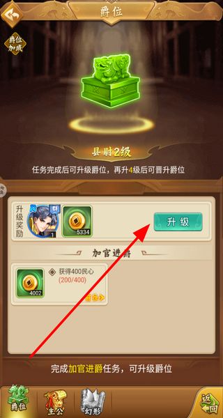 3、进入爵位界面,点击升级提升爵位等级,升级后还能解锁加官进爵任务,完成任务可进一步提升爵位。